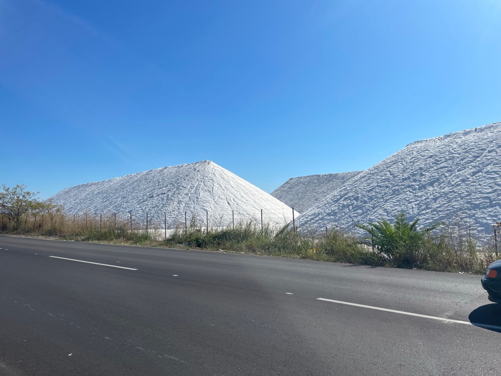 I cycled past some massive piles of white powder . Seeing as I wasn’t in the middle of an episode of Breaking Bad, I assumed it was salt or some other mineral maybe . In any case, it was impressive to see