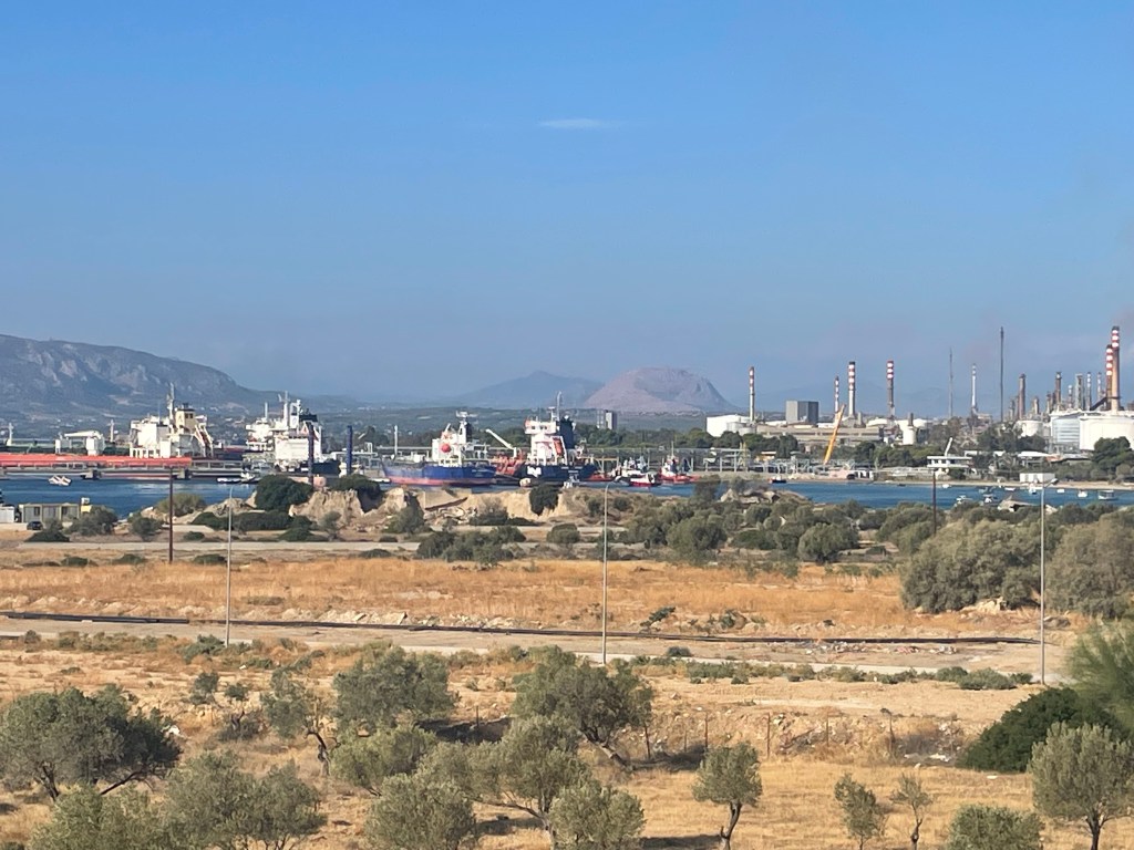 It was a baking hot day . I left Loutraki along a service road that ran parallel to the main road out of town, and for a while the landscape was quite industrial and busy. A mile or so alongside a number of oil refineries made me realise how loud they were.