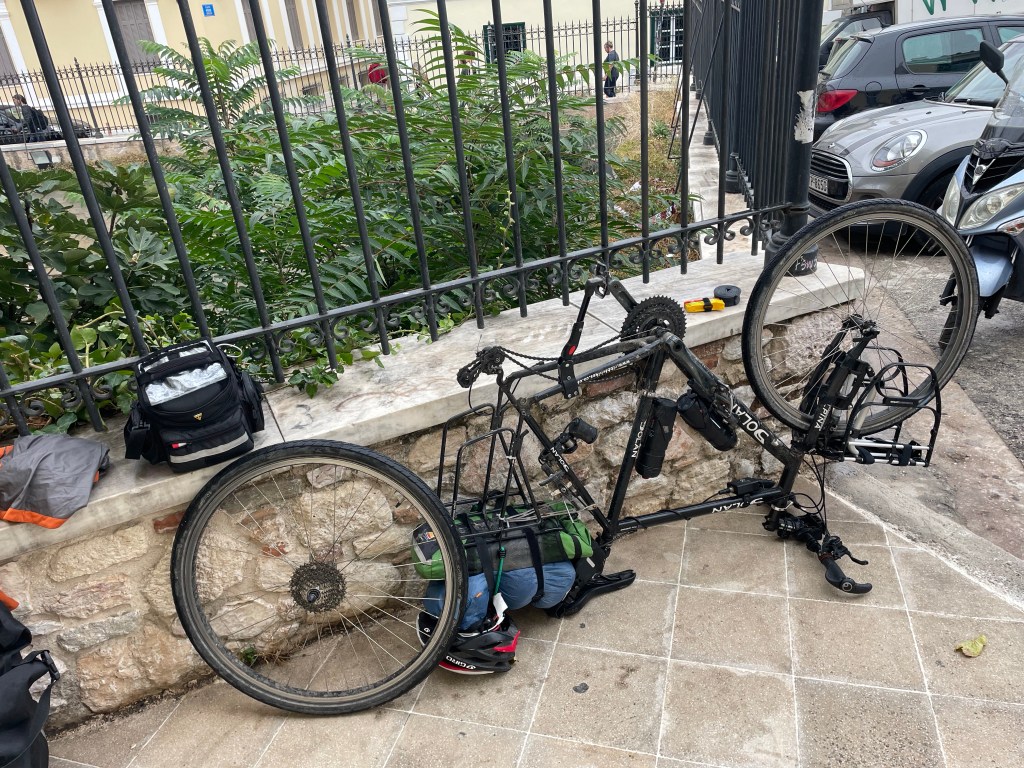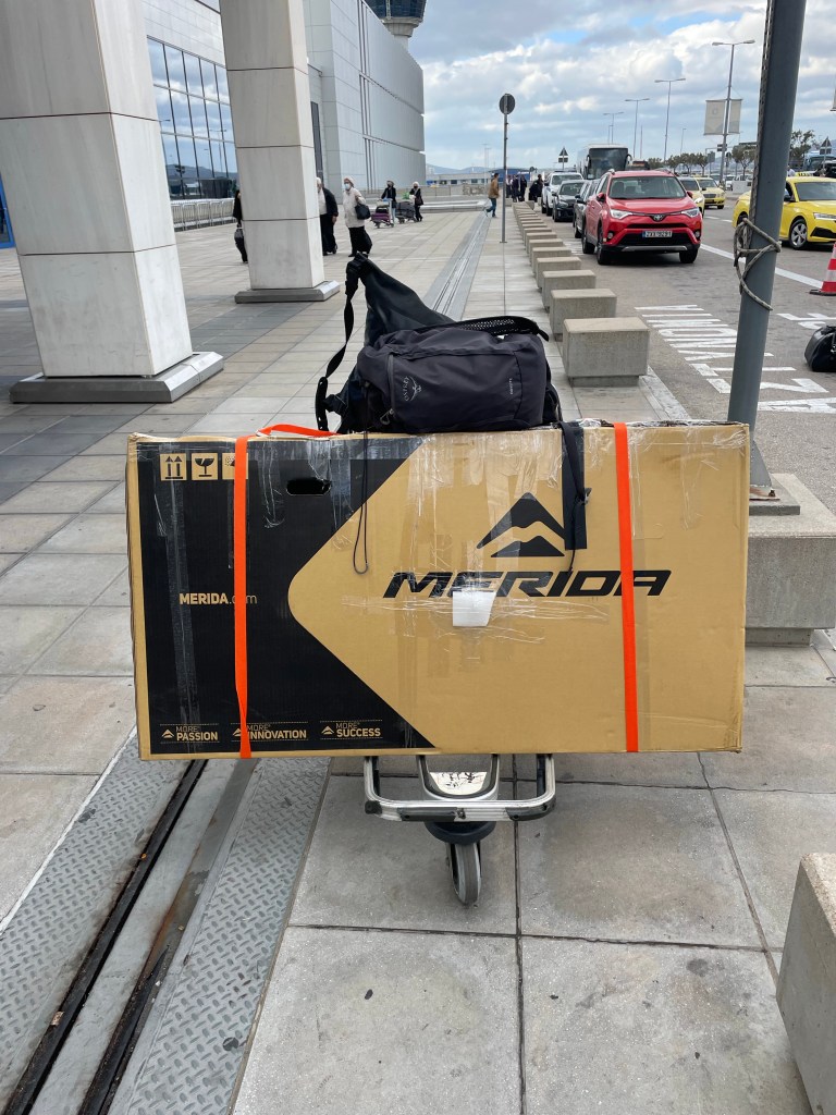 Jackpot. Not only did the English speaking owner Agi have a spare box, he was the only Dolan dealer in Greece and a cycle tourist himself. We had coffee and pastries and plenty of bike chit chat while he sorted the box and half an hour later I was heading back to the hotel with what I needed to get home .