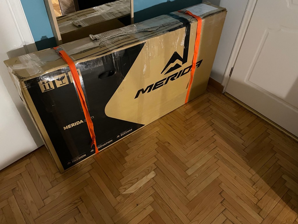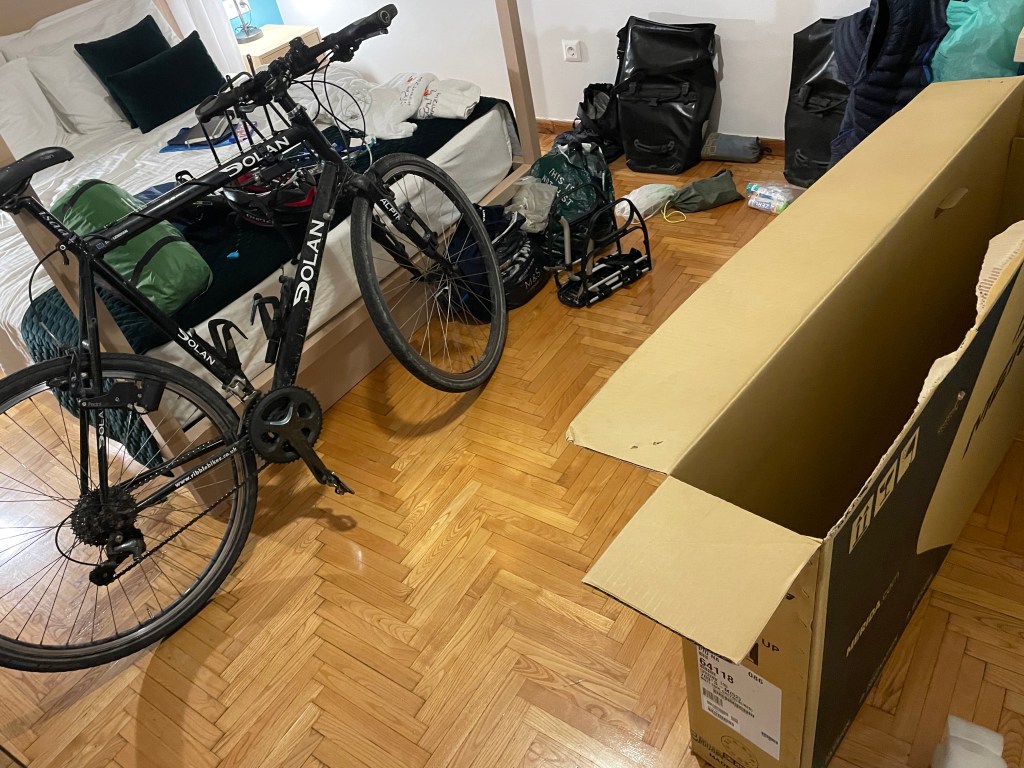 So how to get my bike home? I needed to source a cardboard bike box of the kind bike shops take delivery of new bikes in. I’d then break my bike down (wheels off, handlebars turned,pedals off, racks and seatpost removed, tyres deflated), and pack it in the box so it could be checked in onto a flight .