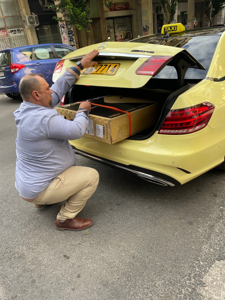I thought it worth one last try and rode back into the town to find a taxi rank . A queue of taxis were waiting for business and once I’d explained what I was after, it became a matter of national pride to fit my large bike into the smallest of taxis. My cheery cabbie was happy to help, I think doing his bit for the resistance and railing against the “is stupid, crazy stupid Greek Government” that had banned bikes from the tunnel in the first place .