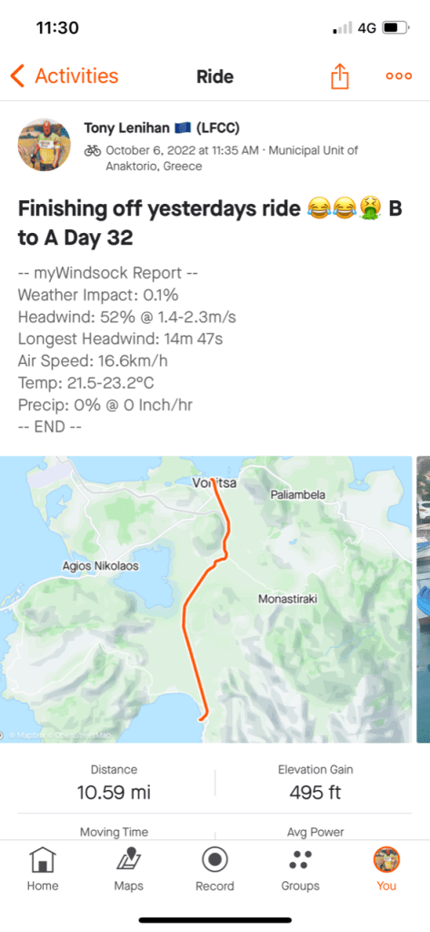But by the time I got to Vonitsa at halfway, I was feeling pretty rough. Stomach cramps, jelly legs and pouring with cold sweats, I think the late start, lack of fluids and unrelenting heat had given me an old fashioned dose of heat exhaustion. It took me by surprise because I’d been super diligent about drinking but I think the fragmented nature of this day in particular just caught me out .