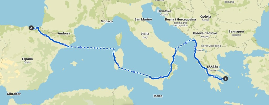 My aim is to use a combination of pedal power and ferries (I love ferries!!) to travel West to East over the eight weeks of September and October . The provisional plan is Spain-ferry-Sardinia-ferry-Sicily,Italy and another ferry across the Adriatic to either Croatia or Montenegro. This last bit depends on all the usual cycle touring factors such as energy, time elapsed,funds etc and will dictate how I actually get back home
